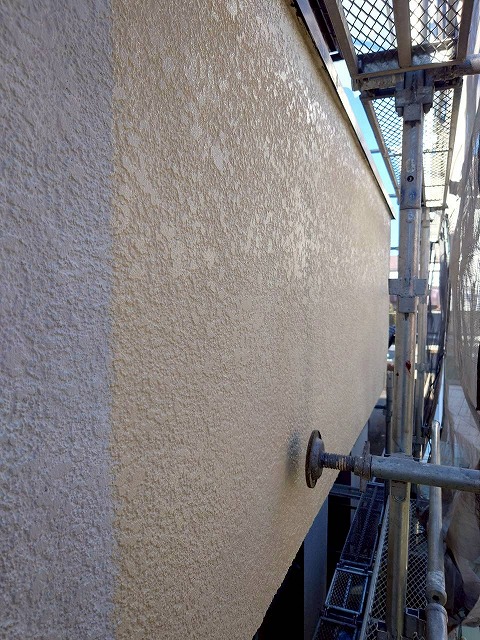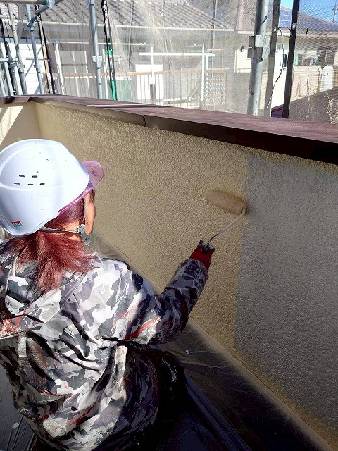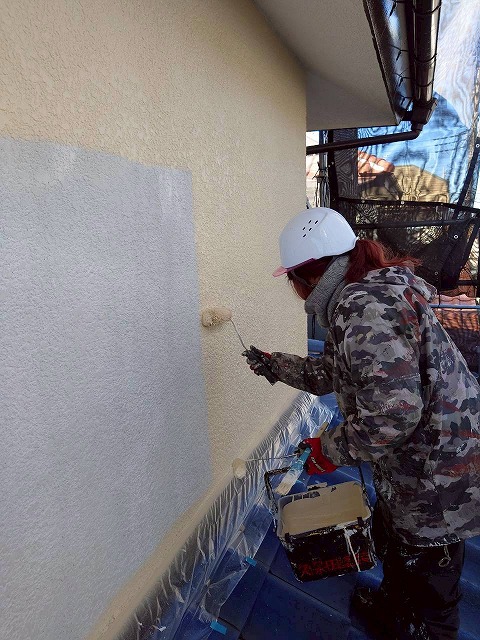 本日は、外壁塗装工事の中塗り作業の様子をご紹介いたします。