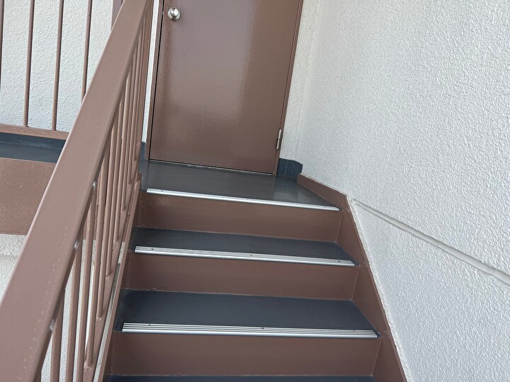 江戸川区北小岩のマンションにて実施した、鉄部塗装およびノンスリップ交換工事の様子をご紹介いたします。