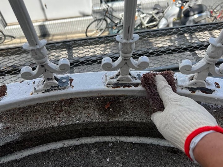 鉄部を塗装する際は、下地のサビや汚れを取り除き、表面に凹凸をつけることで塗料の付着性を高めるケレン作業を行います。