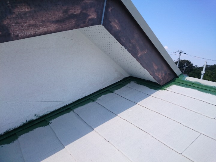大屋根の化粧スレートは、上塗りと呼ばれる三回塗りの最後の工程に入っています。