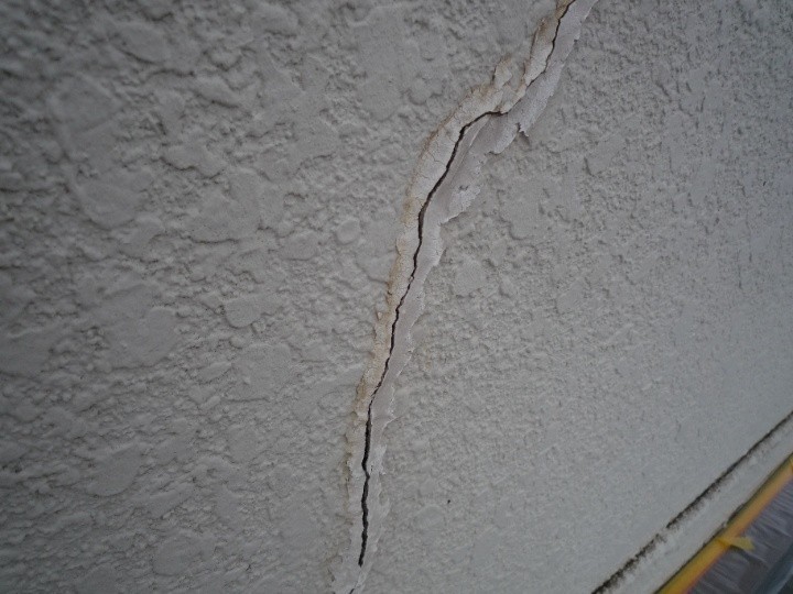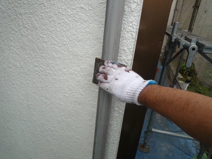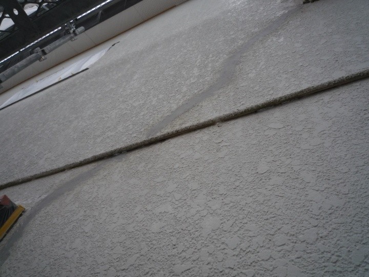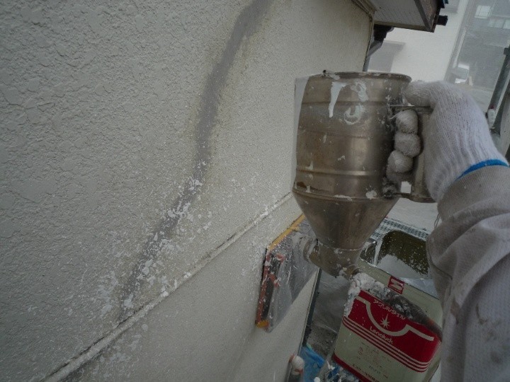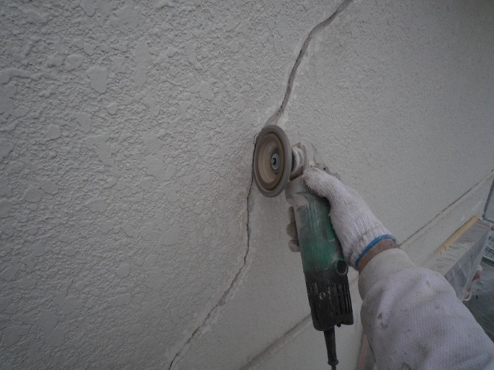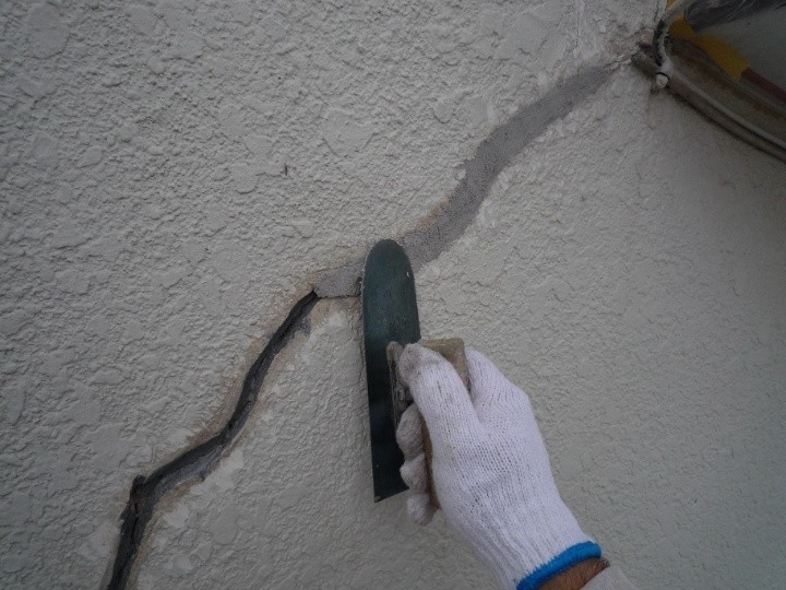 今回の外壁塗装工事の主であるクラック補修を行います。本工事において最も手間のかかる工程であり、ここを丁寧に実施しなければ、工事の効果を十分に得ることはできません。