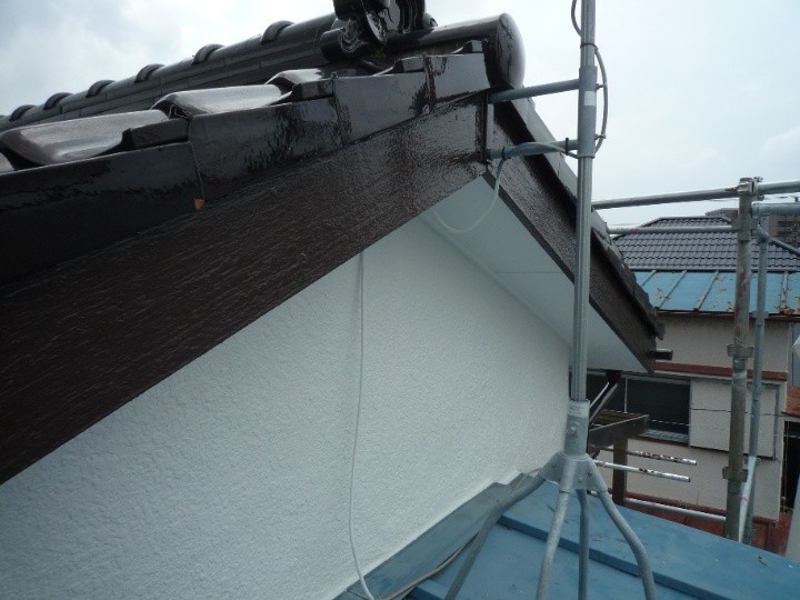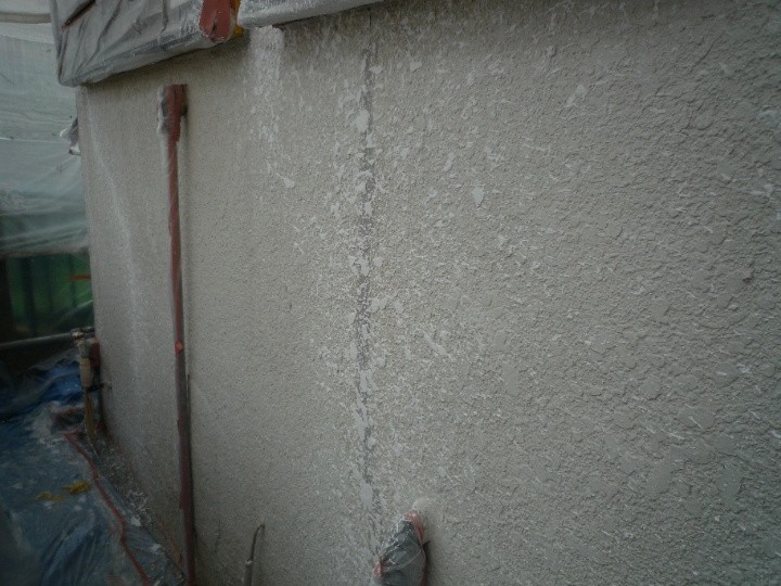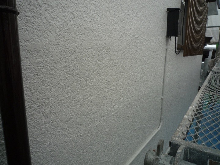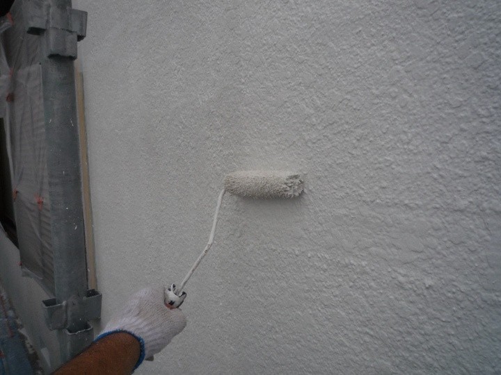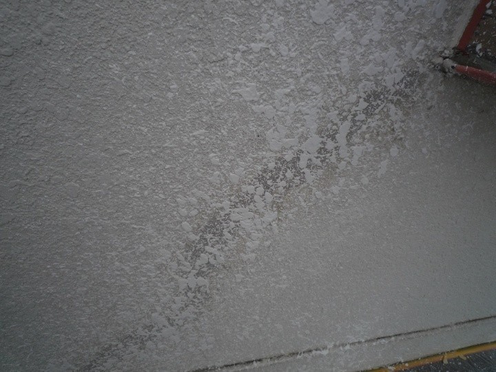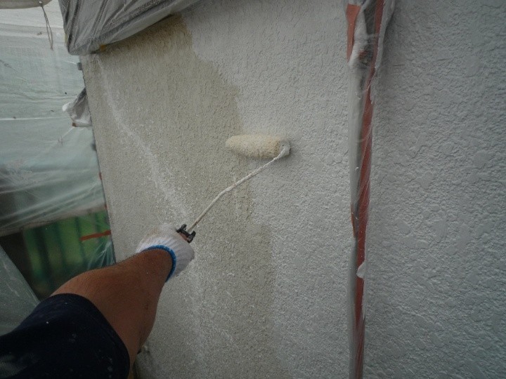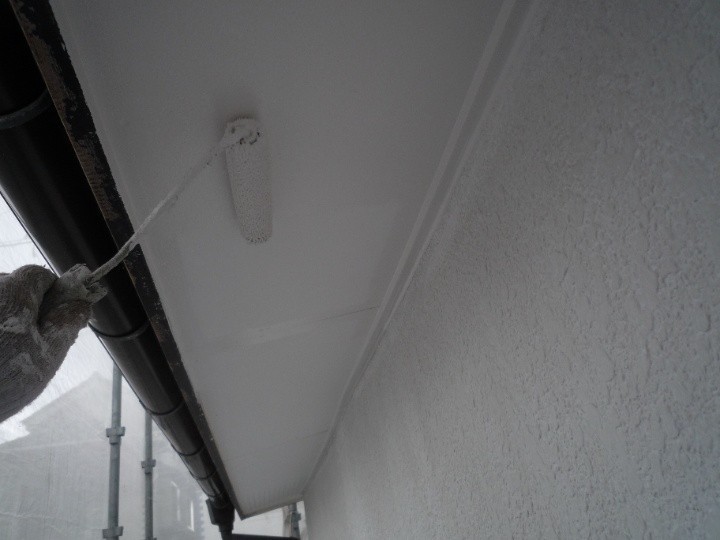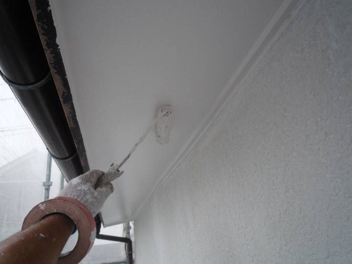 下塗りである『ソフトリカバリー』の塗布が完了した後は、中塗りおよび上塗りの二回の塗装工程を経て仕上げを行います。下塗りのソフトリカバリーも白色であり、今回お客様にお選びいただいた仕上げ塗料である水系ファインコートシリコンの色も白色のため、写真では差がわかりにくくなっております。