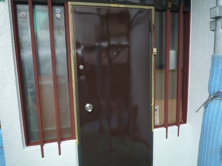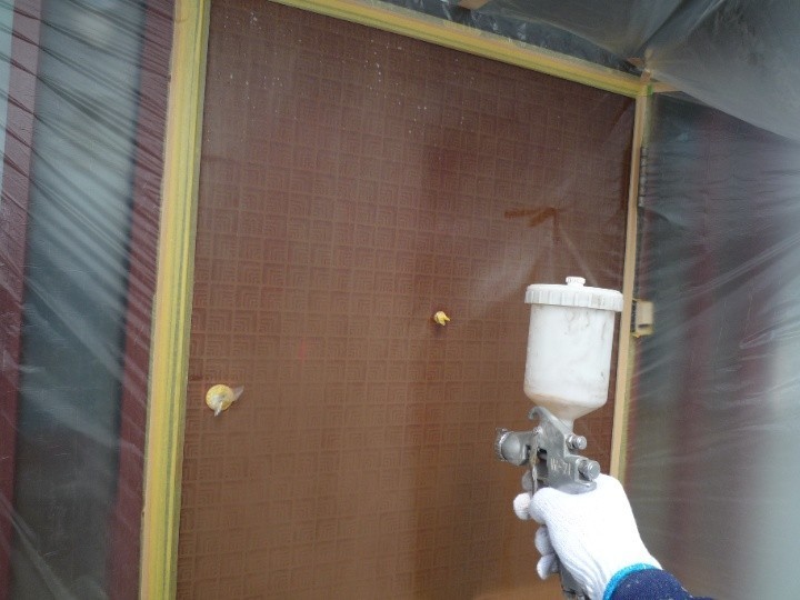 玄関ドアの塗装も行いました。施工工程は他の箇所と大きく変わりませんが、仕上がりが特に重要視される部分であるため、見ている方は緊張されることもあります。