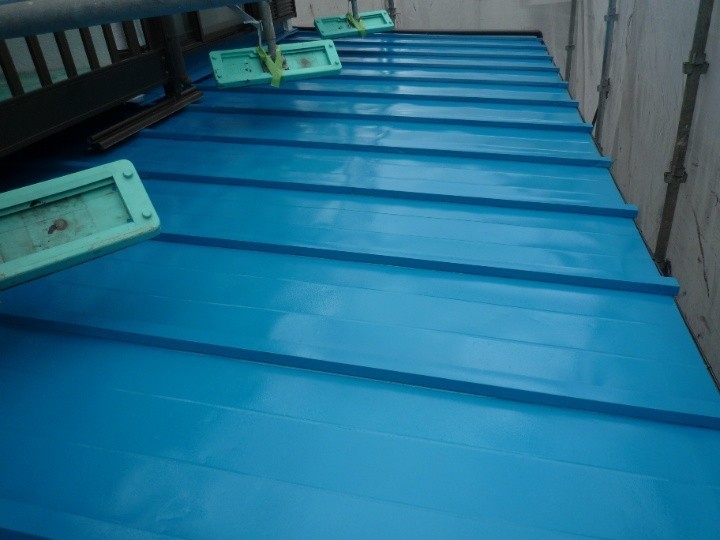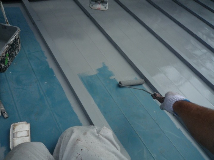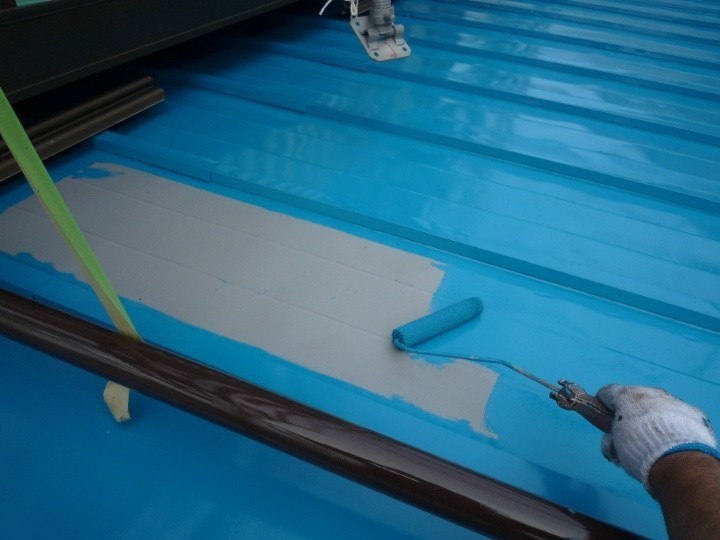 下塗りとして錆止めを塗布した後は、中塗りおよび上塗りの二回の塗装工程を経て仕上げてまいります。屋根カバー工事も同時に行っているため、仕上げ塗料の色は屋根カバーの色に合わせており、ニットコウの製品から選定いたしました。