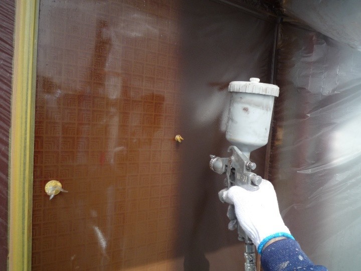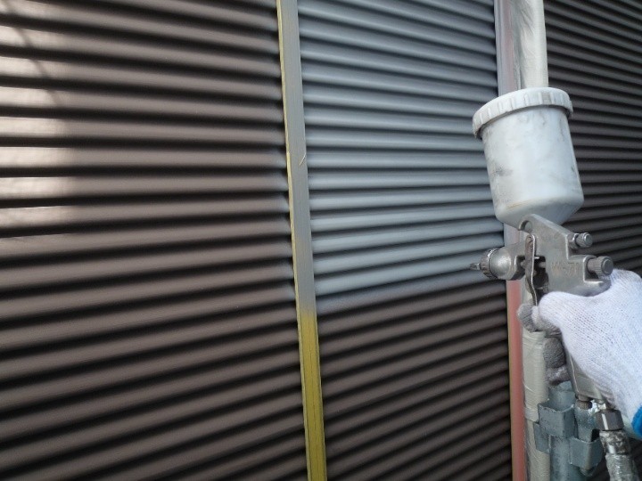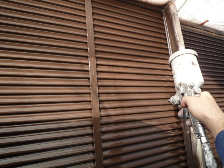 雨戸の塗装は、仕上がりの美しさを考慮して、ほとんどの場合吹付けで行います。作業にあたっては、周囲への塗料の飛散に十分注意を払いながら施工しております。