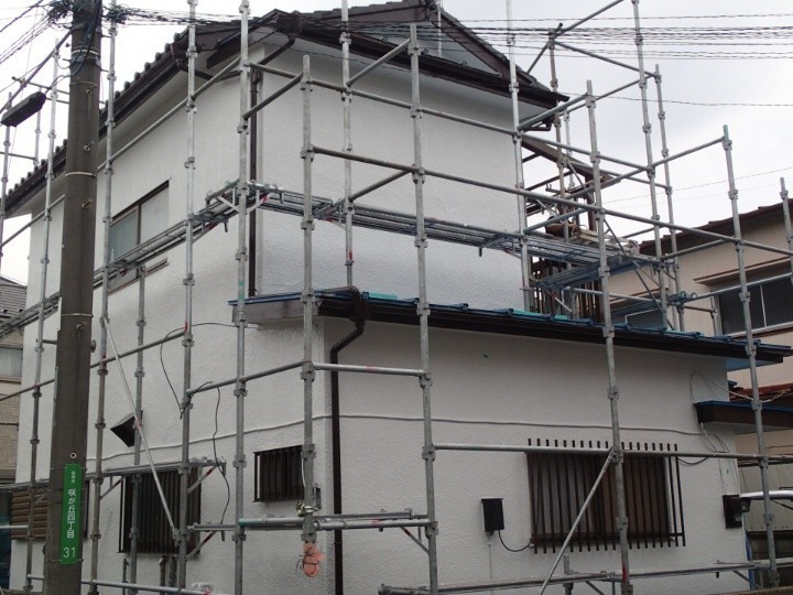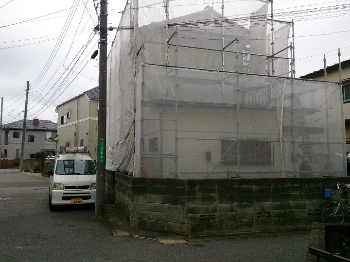 まず足場の架設工事を行いました。近隣への飛散防止のため、メッシュシートも十分に張り巡らせ、安全かつ万全の準備を整えております。