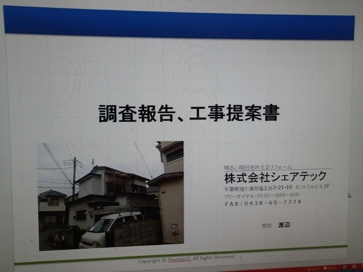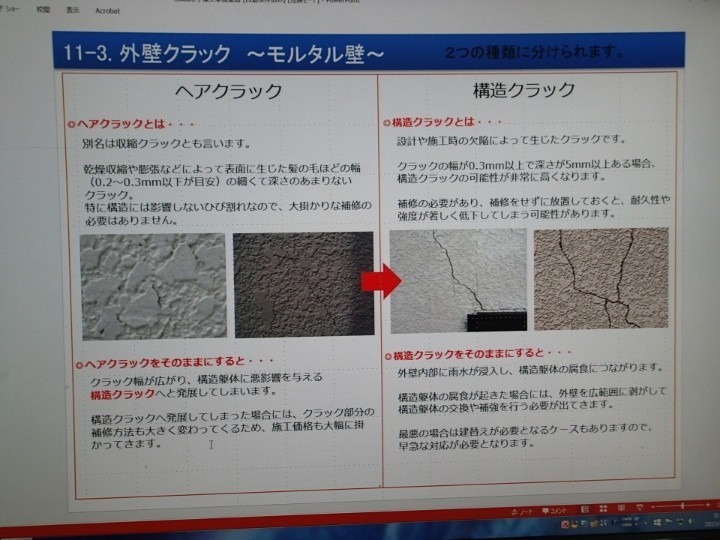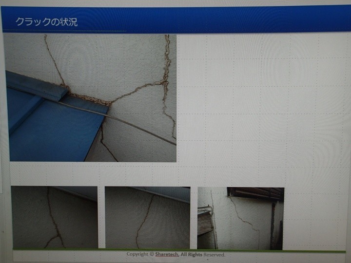 調査の内容をもとに、ご報告と修繕方針に基づいた工事のご提案をさせていただきました。お客様には分かりにくい場合の多い亀裂(クラック)の種類についても、可能な限り資料や写真を用いて、分かりやすくご説明するよう心がけております。