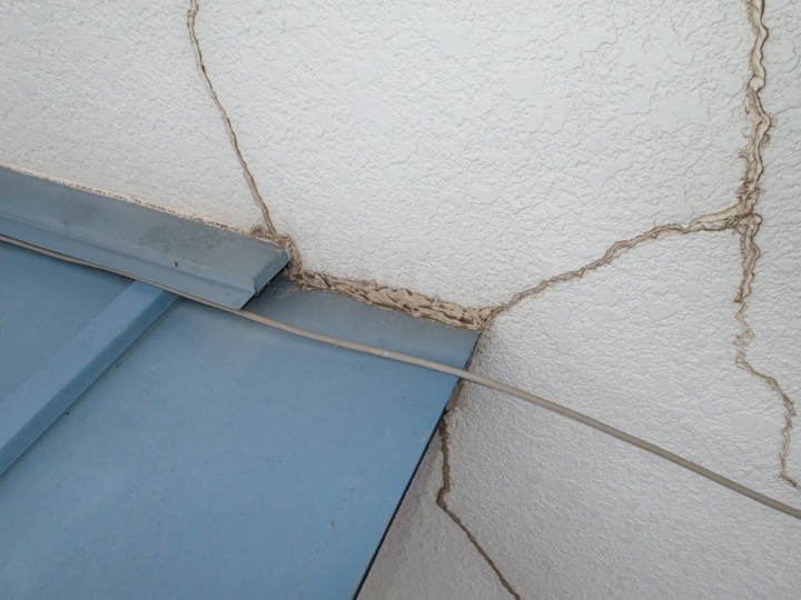 該当箇所の外部は下屋根にあたります。壁と屋根の取り合い部分には大きな亀裂の跡(クラック)があり、コーキングで補修された跡も見られます。しかし、この部分からの浸水の影響も考えられます。