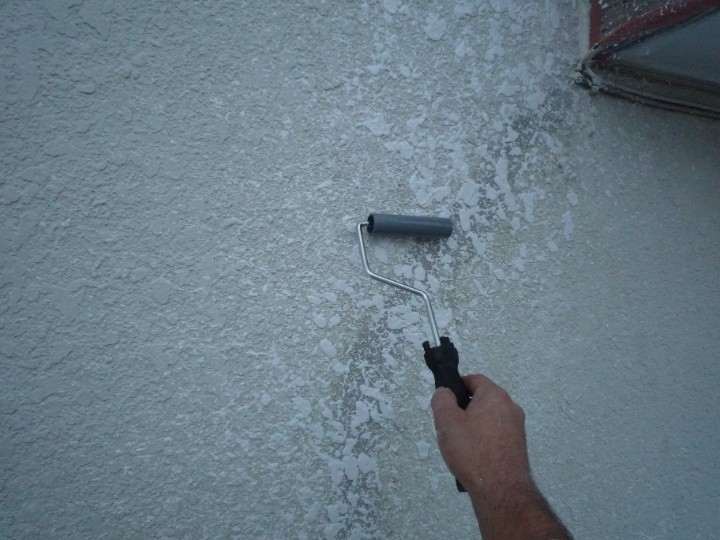 先ほど樹脂モルタルを摺り込み、平滑に整えた部分も、そのままでは既存の壁の模様と一致しないため、直接塗装を行うと補修跡が目立ってしまいます。