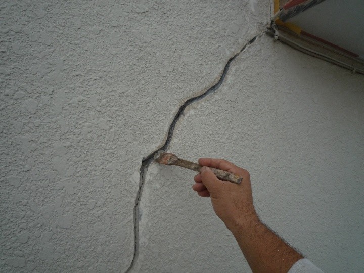 建物の各所に見られるクラックに対しても、同様にVカット処理を施していきます。これにより、クラック補修跡をできるだけ目立たなくするための工程に進むことができます。