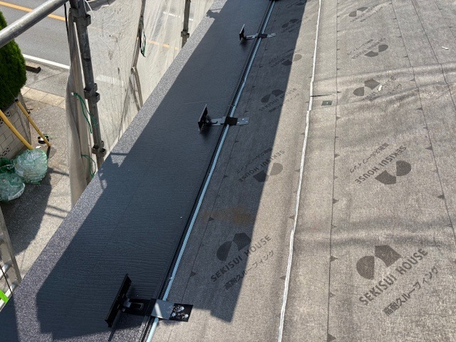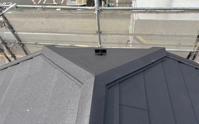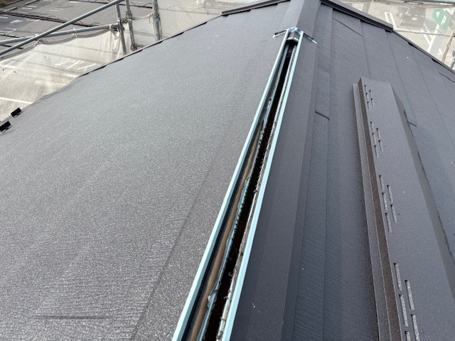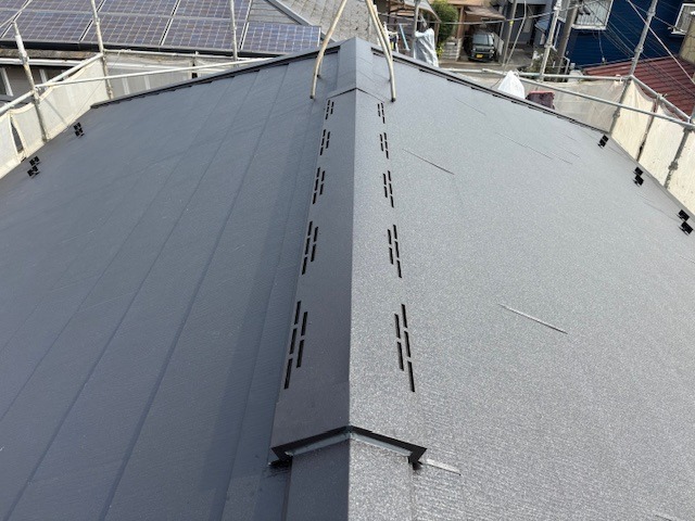 しい棟板金を設置し、下地材やシーリング処理で雨水の侵入を防ぎます。棟部分は風の影響を受けやすく、雨水が集まりやすい箇所です。職人が細部まで確認し、確実に仕上げました。