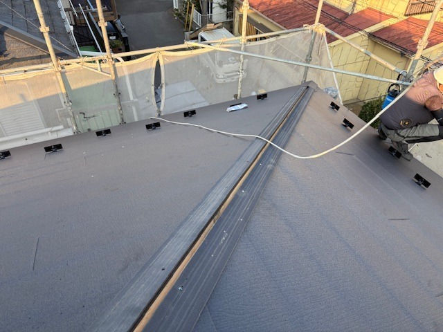 断熱材一体型の軽量金属屋根「スーパーガルテクト」を施工します。