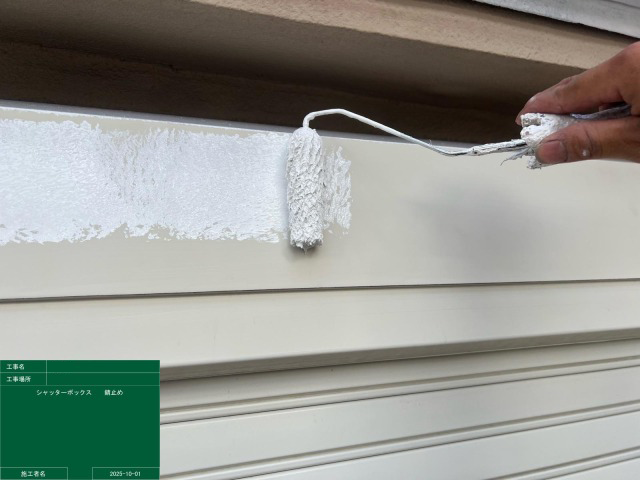 これでシャッターボックスの塗装も完了です。シャッターボックスと同様に庇、雨樋、水切りなどの付帯部も塗装し、全てを綺麗に仕上げます。