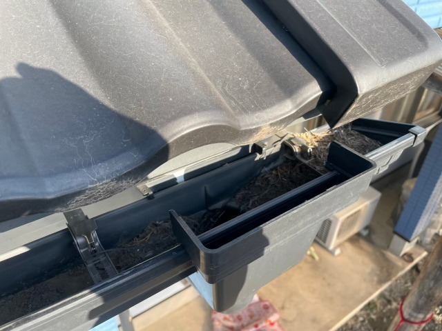 現地調査に伺うと、玄関上の軒樋にゴミがたまっているのは確認できましたが、2階の軒樋にはゴミを確認できませんでした。