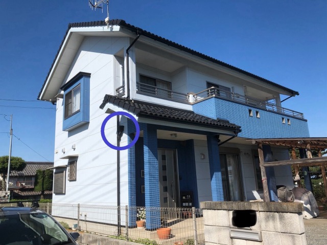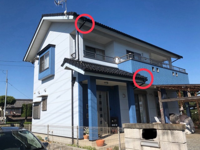 「玄関上と玄関横の雨樋から雨水があふれているみたい。外壁塗装をしてきれいになったのに、雨シミが付くと嫌だから、何とかならないか」と、ご相談をいただきました。