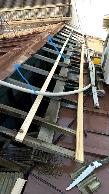 剥がした波板の下は通路になっているので、ポリカ波板を張って塞がないと、この季節は夕立が心配です。